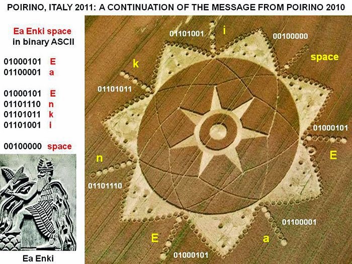 Alcuni hanno suggerito la risposta a questa domanda è stato rivelato attraverso l'aspetto di un altro cerchio nel grano in Italia nel 2011. Lì, nella piccola città di Poirino, un cerchio nel grano è emerso, che ha raffigurato una stella a sette punte. Contenuto nel disegno era un codice binario che sembrava identificare il suo creatore come qualcuno di nomeEnki .
